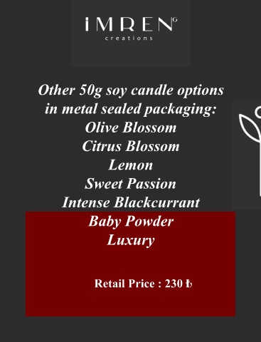 Other 50g soy candle options in metal sealed packaging: Olive Blossom Citrus Blossom Lemon Sweet Passion Intense Blackcurrant Baby Powder Luxury Retail Price : 230 ₺